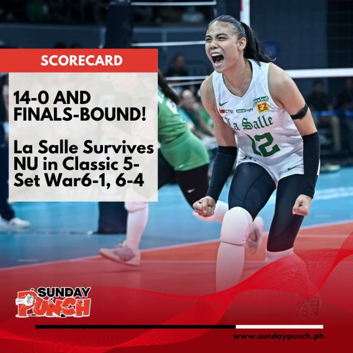 De La Salle just punched its ticket the hard way. The Lady Spikers outlasted defending champ National University in a five-set war, 27-25, 15-25, 23-25, 25-23, 15-13, Sunday night at MOA Arena, sealing an outright Finals berth in the UAAP Season 88 women’s volleyball tournament.